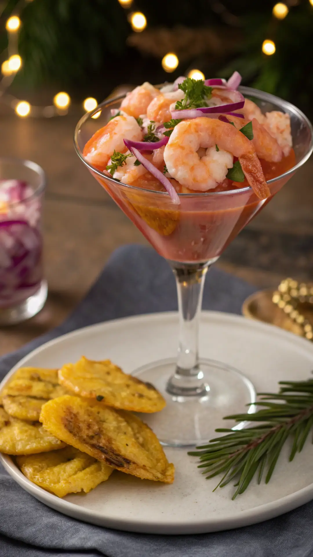 • Ceviche de corvina infusionada en leche de coco sobre canastas de plátano.